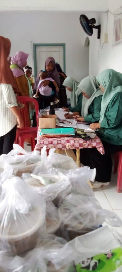 Setelah pemeriksaan, dilanjutkan dengan pembagian makanan tambahan (PMT) untuk balita dan ibu hamil. PMT yang diberikan berupa paket makanan bergizi yang diharapkan dapat mendukung pertumbuhan dan perkembangan anak serta menjaga kondisi ibu hamil tetap sehat selama kehamilan.
